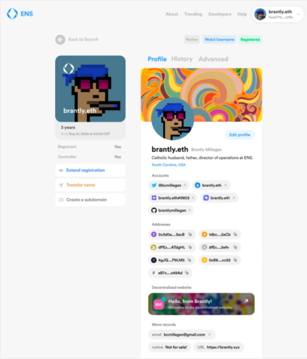 域名和钱包都可以视作身份管理容器:钱包可以用一个域名作为钱包账户名的替代,并将其作为和应用方交互时的「姓名」,同时域名可以整合多个链上地址甚至多个钱包账户,它也是天然的身份聚合器。